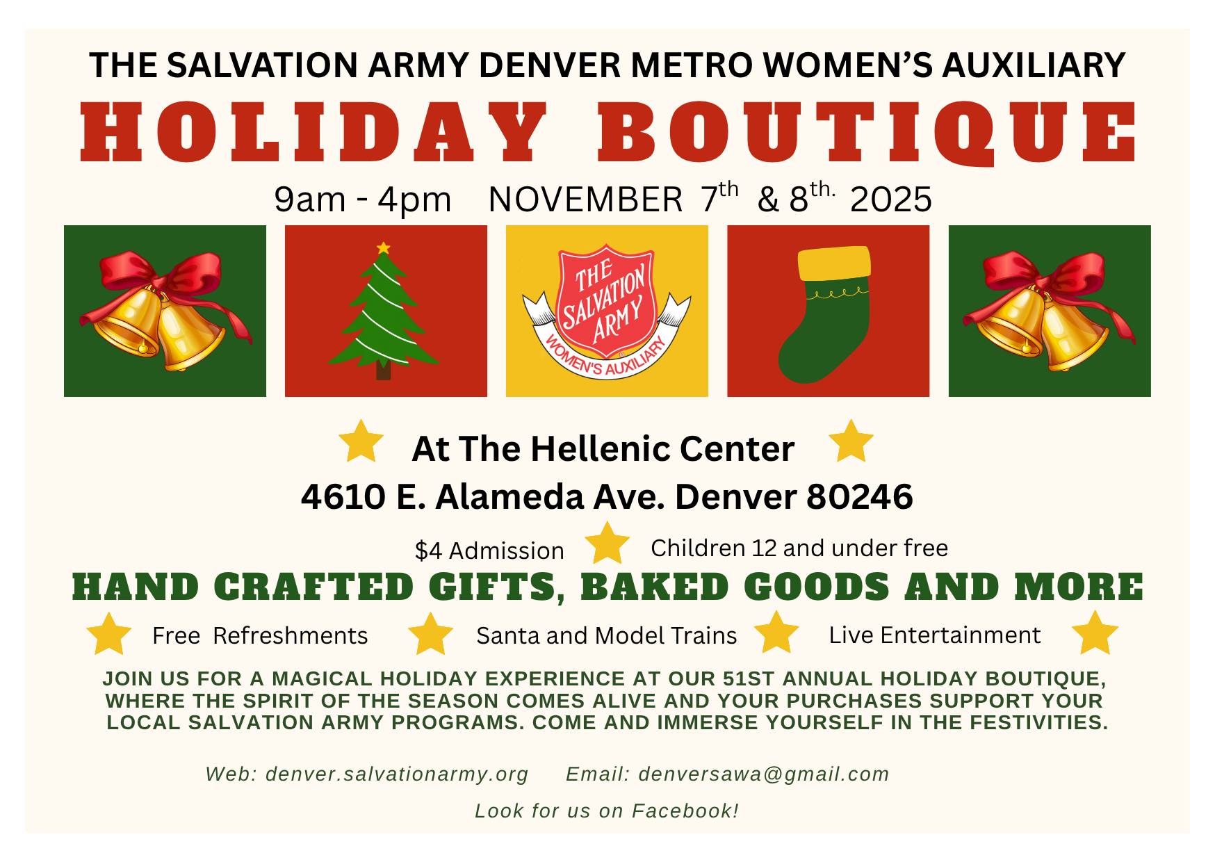 We invite you to join the Denver Metro Women’s Auxiliary in supporting the Salvation Army in the Denver Metro communities. Please contact us with any questions or how to get involved at denversawa@gmail.com.